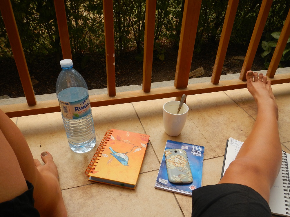 - a balcony, on the ground floor (so I guess that’s a patio), and if I sat down (on the floor of the patio,) there were bushes that totally hid me but even if I stood, there weren’t many people around at all