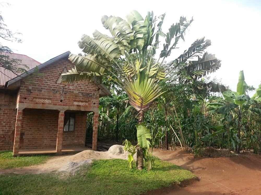 After breakfast, Lucy took me on a walk to the nearest town, Kalisizo, from our village called Kisunku. It is 3 km away (a little over a mile). It is a gorgeous walk, homes scattered here at there, lots of farms, mostly banana trees and corn and potatoes. Also lots of mango and jackfruit trees. The roads are mostly red dirt, just like in Liberia. The plants are quite different than in Liberia, no coconuts for example. 🙁 But still the trees and vegetation are gorgeous, even conifer (pine like) trees. When we got to Kalisizo, we went to the hotel. It looks like a beautiful, nice hotel with what seems to be a very nice restaurant also. It has very nice wifi in the lobby, so we sat there for over an hour drinking coffee and doing our work. The power died at one point so we worked off line and then packed up and went further into town so that I could by a couple drug store items.