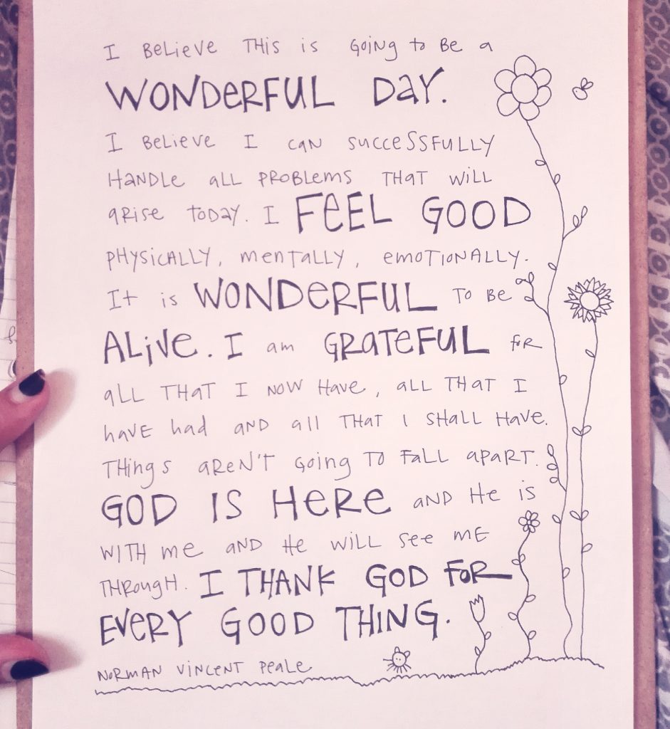 This awesome and inspiring poem was written by Norman Vincent Peale and is from his book “The Power of Positive Thinking”. He says he reads it every morning. I’ve been reading it every morning for the past several months and I feel really good when I read it. Try it out!