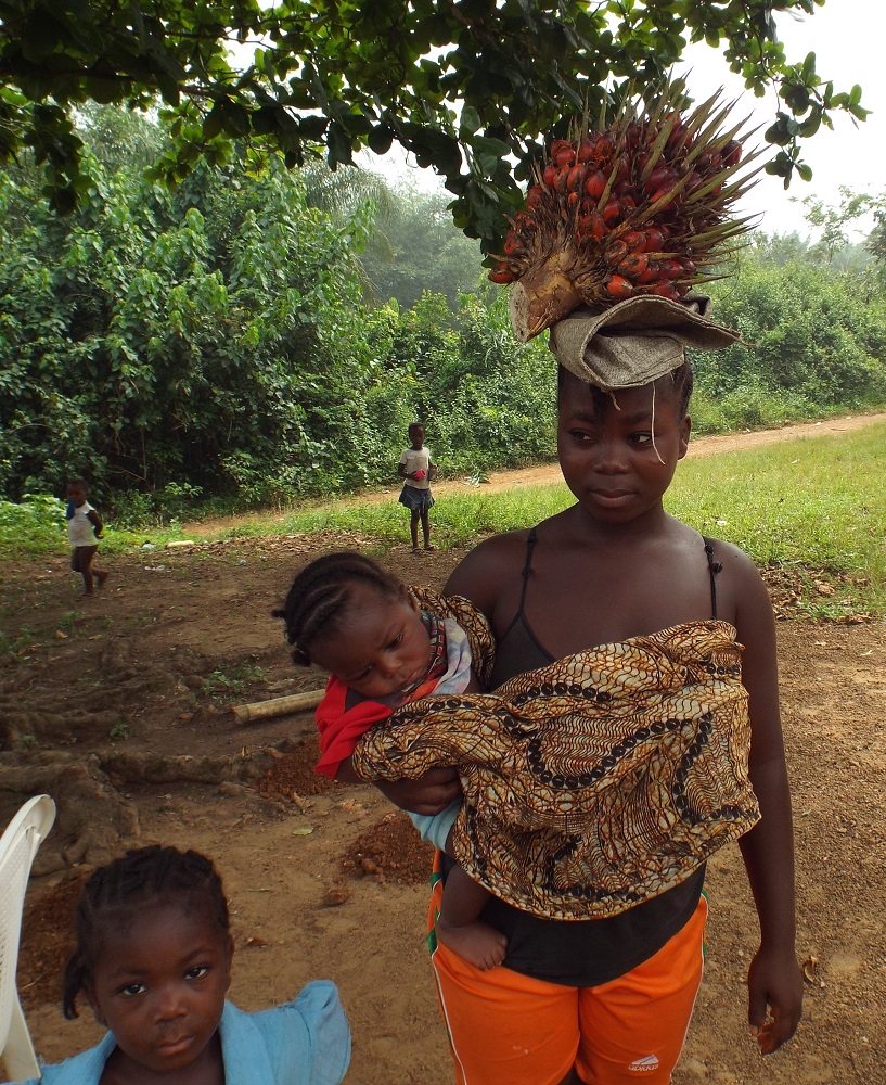In Clements Village near Fendell. The woman just collected these palm nuts. The red meat is taken off and beaten into palm oil or palm butter, both are used a lot here for cooking. The kernel inside the red part can also be used for another type of oil but I don’t know a lot about that.