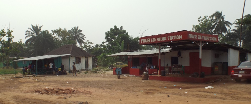 One of the gas stations. Lots of businesses are named interesting names like that here. This gas, is just in glass jars and they dump it into your vehicle. We have been using more standard gas stations with regular pumps like in the US.