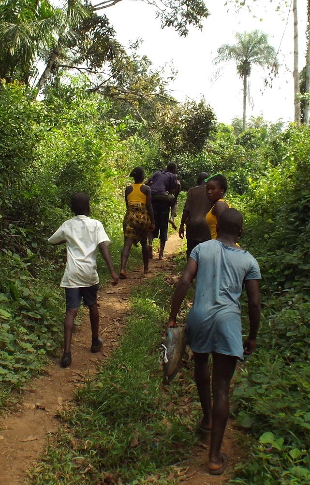 Clements Village people hiking back to the village from the river after baptisms. The guy in the front, Will, is carrying an old blind man. Both got baptized that day.